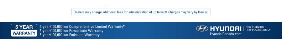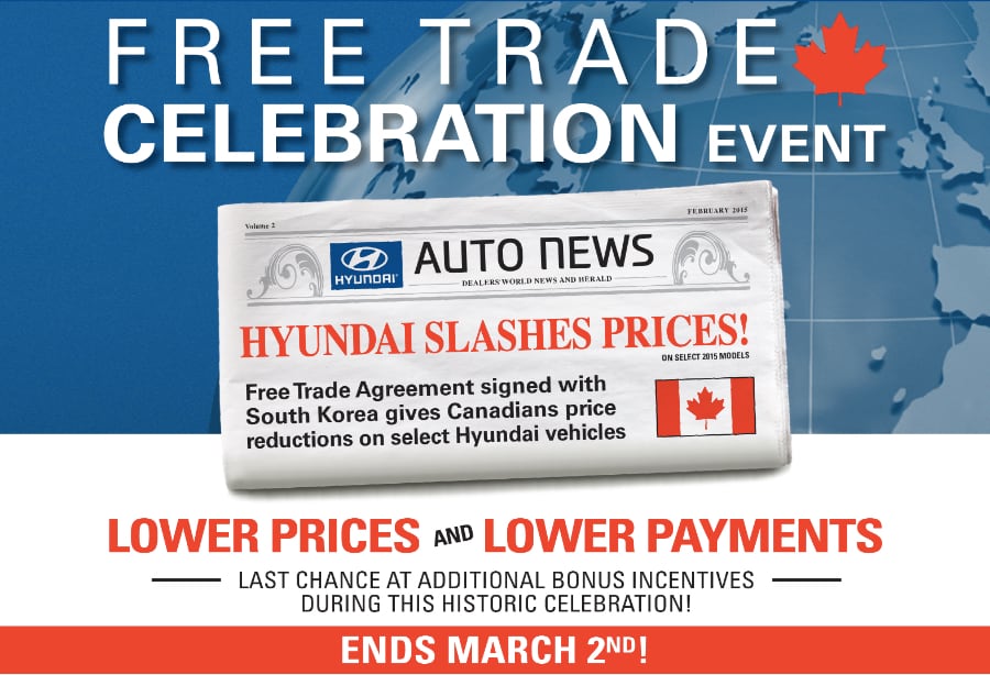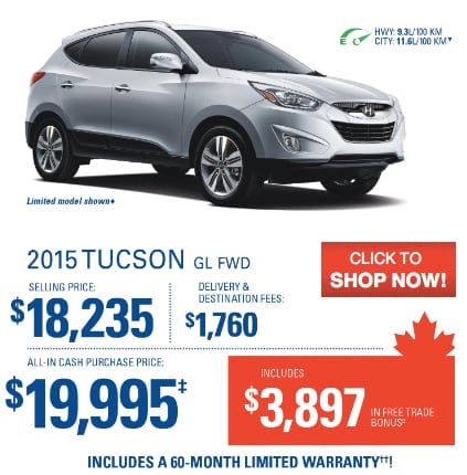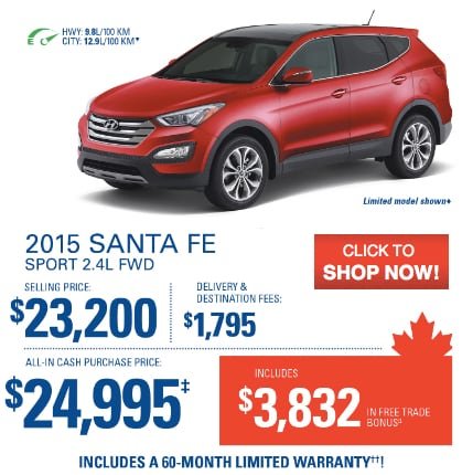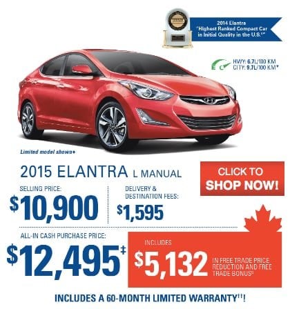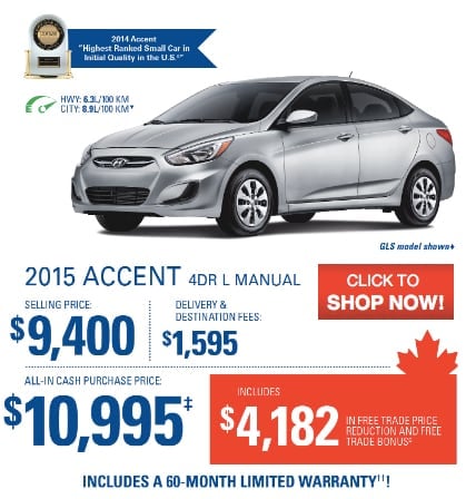 The Hyundai names, logos, product names, feature names, images and slogans are trademarks owned by Hyundai Auto Canada Corp. Cash price of $10,995/$12,495/$19,995/$24,995 available on all new 2015 Accent 4-Door L Manual/Elantra Sedan L Manual/Tucson GL FWD/ Santa Fe Sport 2.4L FWD models and includes price reductions of $300/$600/$0/$0. Prices include Delivery and Destination charges of $1,595/$1,595/$1,760/$1,795, fees, levies and all applicable charges (excluding HST). Prices exclude registration, insurance, PPSA, license fees and dealer admin. fees of up to $499. Fees may vary by dealer. Delivery and Destination charge includes freight, P.D.E. and a full tank of gas. Free trade bonuses are calculated against the vehicle's starting price. Free trade bonus of up to $3,882/$4,532/$3,897/$3,832 available on all new 2015 Accent 4-Door L Manual/Elantra L Manual/Tucson GL FWD/Santa Fe Sport 2.4L FWD models. Price adjustments applied before taxes. Offer cannot be combined or used in conjunction with any other available offers. Offer is non-transferable and cannot be assigned. No vehicle trade-in required. Prices of models shown: 2015 Accent GLS Auto/Elantra Limited/Tucson Limited AWD Santa Fe Sport Limited AWD are $20,930/$26,930/$35,895/$41,580. Prices include Delivery and Destination charges of $1,595/$1,595/$1,760/$1,795, levies and all applicable charges (excluding HST). Prices exclude registration, insurance, PPSA, license fees and dealer admin. fees of up to $499. Fees may vary by dealer. Fuel consumption for new 2015 Accent GLS (HWY 6.3L/100KM; City 8.9L/100KM); 2015 Elantra Limited (HWY 6.7L/100KM; City 9.7L/100KM); 2015 Tucson Limited AWD (HWY 9.3L/100KM; City 11.6L/100KM); 2015 Santa Fe Sport Limited AWD (HWY 9.8L/100KM; City 12.9L/100KM); are based on Manufacturer Testing. Actual fuel efficiency may vary based on driving conditions and the addition of certain vehicle accessories. Fuel economy figures are used for comparison purposes only. ?The Hyundai Accent/Elantra received the lowest number of problems per 100 vehicles among small/compact cars in the proprietary J.D. Power 2014 Initial Quality StudySM (IQS). Study based on responses from 86,118 new-vehicle owners, measuring 239 models and measures opinions after 90 days of ownership. Propriety study results are based on experiences and perceptions of owners surveyed in February-May 2014. Your experiences may vary. Visit jdpower.com. Government 5-Star Safety Ratings are part of the U.S. National Highway Traffic Safety Administration's (NHTSA's) New Car Assessment Program (www.SaferCar.gov). Offers available for a limited time and subject to change or cancellation without notice. Dealer may sell for less. Inventory is limited, dealer order may be required. Visit www.hyundaicanada.com or see dealer for complete details. Hyundai's Comprehensive Limited Warranty coverage covers most vehicle components against defects in workmanship under normal use and maintenance conditions.