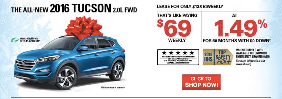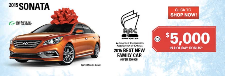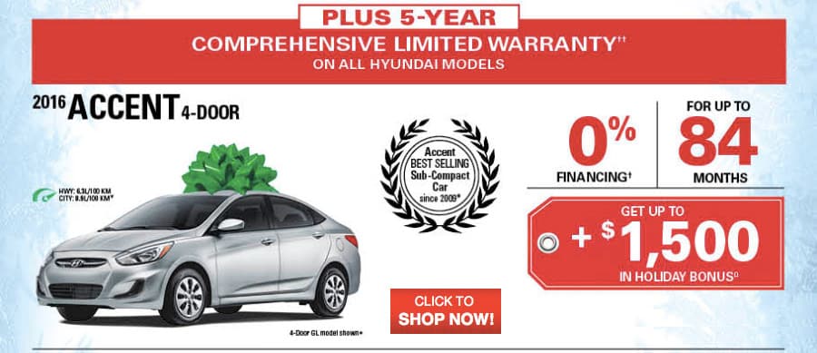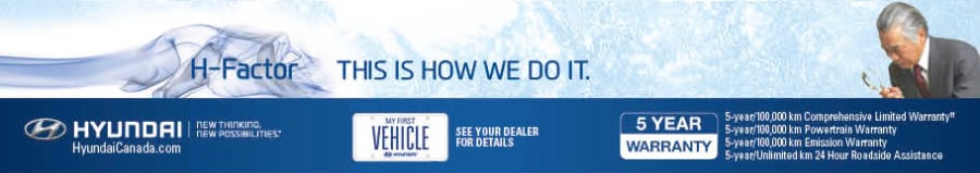 The Hyundai names, logos, product names, feature names, images and slogans are trademarks owned by Hyundai Auto Canada Corp. All other trademarks are the property of their respective owners. Finance offers available O.A.C. from Hyundai Financial Services based on a new 2016 Elantra L Manual/2016 Santa Fe Sport 2.4L FWD/2016 Accent 4-Door L Manual with an annual finance rate of 0% for 84 months. $0 down payment required Cost of borrowing is $0. Finance offers include Delivery and Destination charges of $1,695/$1,895/$1,595, levies and all applicable charges (excluding HST). Finance offers exclude PPSA and license fees. Financing example: 2016 Elantra L Manual at 0% per annum equals $85 biweekly for 84 months for a total obligation of $15,627. $0 down payment required. Cost of borrowing is $0. Finance example includes Delivery and Destination charge of $1,695, levies and all applicable charges (excluding HST). Finance example excludes PPSA and license fees. Delivery and Destination charge includes freight, P.D.E. and a full tank of gas. Holiday bonus of up to $2,000/$1,500/$2,000/$5,000 available on all new 2016 Elantra L Manual/2016 Accent 4-Door L Manual/2016 Santa Fe Sport 2.4L FWD/2015 Sonata models. Price adjustments applied before taxes. Offer cannot be combined or used in conjunction with any other available offers. Offer is non-transferable and cannot be assigned. No vehicle trade-in required. Leasing offers available O.A.C. from Hyundai Motor Finance based on a new 2016 Tucson 2.0L FWD with an annual lease rate of 1.49%. Biweekly lease payments of $138 for a 60-month walk-away lease. Down payment of $0 and first monthly payment required. Total lease obligation is $17,940. Lease offer includes Delivery and Destination charge of $1,795, levies, and all applicable charges (excluding HST). Lease offer excludes PPSA and license fees. $0 security deposit on all models. 20,000 km allowance per year applies. Additional charge of $0.12/km. Prices of models shown: 2016 Elantra Limited/2016 Tucson 1.6T Ultimate AWD/2016 Santa Fe Sport 2.0T Limited/2016 Accent 4-Door GL/2015 Sonata Sport 2.0T are $27,677/$41,527/$42,577/$19,577/$32,827. Prices include Delivery and Destination charges of $1,695/$1,795/$1,895/$1,595/$1,695, fees, levies and all applicable charges (excluding HST). Prices exclude PPSA and license fees. Fuel consumption for new 2016 Elantra Limited (HWY 6.7L/100KM; City 9.7L/100KM); 2016 Tucson 1.6T Ultimate AWD (HWY 9.3L/100KM; City 11.6L/100KM); 2016 Santa Fe Sport 2.0T Limited (HWY 9.7L/100KM; City 12.9L/100KM); 2016 Accent 4-Door GL (HWY 6.3L/100KM; City 8.9L/100KM); 2015 Sonata Sport 2.0T (HWY 7.4L/100KM; City 10.4L/100KM) are based on ManufacturerTesting. Actual fuel efficiency may vary based on driving conditions and the addition of certain vehicle accessories. Fuel economy figures are used for comparison purposes only. Government 5-Star Safety Ratings are part of the U.S. National HighwayTraffic Safety Administration's (NHTSA's) New Car Assessment Program (www.SaferCar.gov). Based on the 2009-2015 Global Automakers of Canada (GAC) Sales report. Offers available for a limited time and subject to change or cancellation without notice. Dealer may sell for less. Inventory is limited. Visit www.hyundaicanada.com or see dealer for complete details. Hyundai's Comprehensive Limited Warranty coverage covers most vehicle components against defects in workmanship under normal use and maintenance conditions.